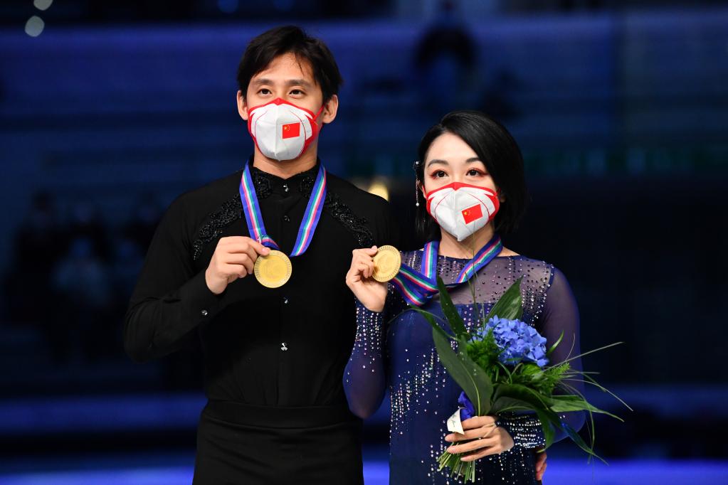 2021年11月7日,双人滑冠军、中国组合隋文静(右)/韩聪在2021-2022赛季花样滑冰大奖赛意大利站颁奖仪式后展示金牌。新华社记者 金马梦妮 摄