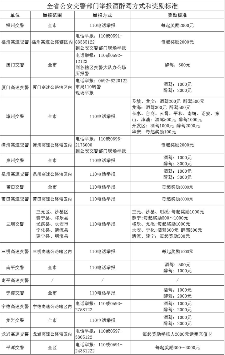 福建公安交警悬赏举报酒驾!(附全省举报方式)