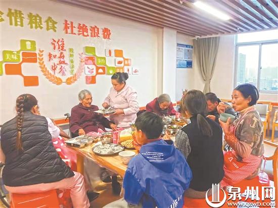 昨晚,在石狮禾康宝盖长者照护中心长者食堂,工作人员精心准备了年夜饭,和5位留在中心过年的老人一起度过温馨的除夕夜。(陈明华 吴玉云 摄)