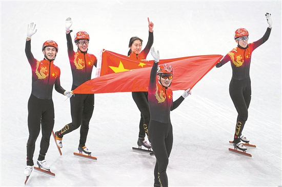 2月5日,在首都体育馆举行的北京2022年冬奥会短道速滑项目混合团体接力决赛中,中国队夺得冠军。图为中国队选手在比赛后庆祝。 (新华)