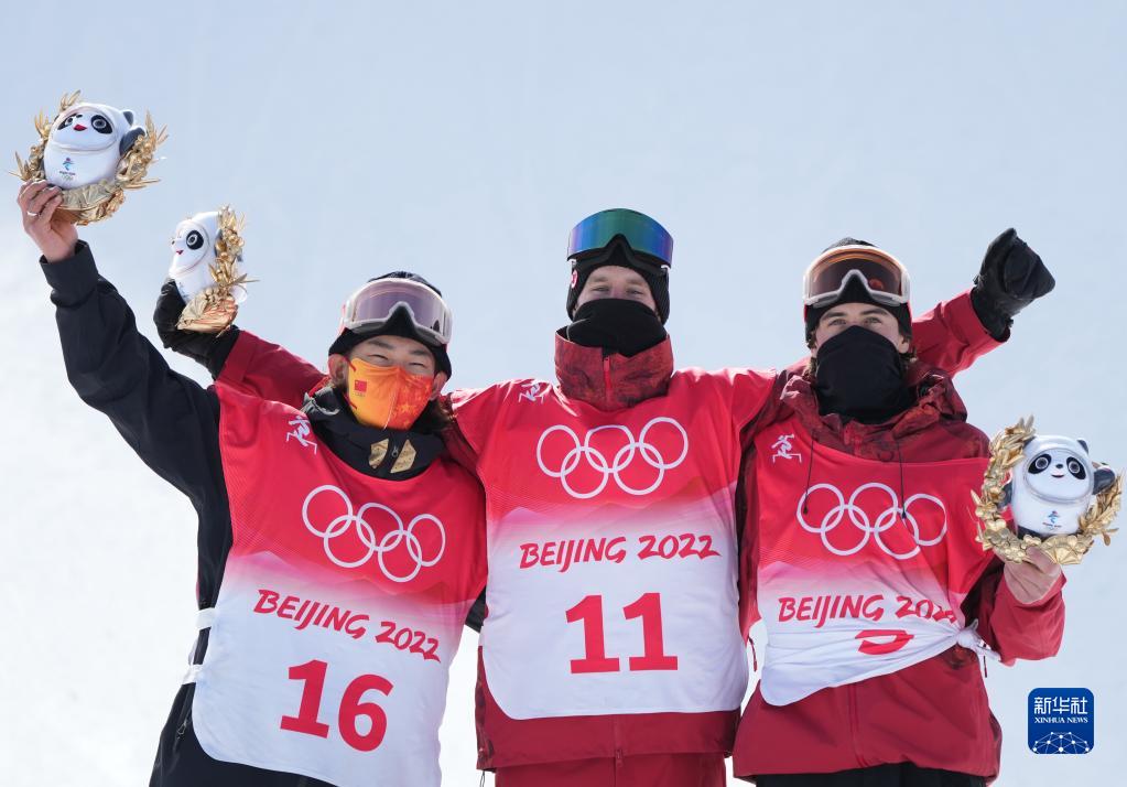 2月7日,获得冠军的加拿大选手马克斯·帕罗特(中),获得亚军的中国选手苏翊鸣(左)和获得季军的加拿大选手马克·麦克莫里斯在颁发纪念品仪式上。新华社记者杨世尧摄
