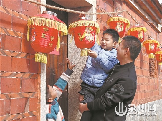 在位于南安市英都镇的全国重点文物保护单位—坂埔古厝,留在本地过年的外来职工与村民们一起布置家园。(黄小燕 摄)