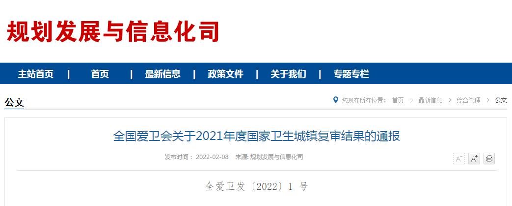 全国爱卫会关于2021年度国家卫生城镇复审结果的通报