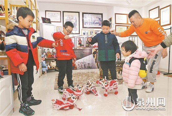 寒假期间,泉州许多小学生在当地非遗文化传承基地,学习闽南文化、做花灯、体验提线木偶技艺,在感受非遗文化魅力的同时,也丰富了假期生活。图为丰泽区第三实验小学一年级的小朋友,在“泉州提线木偶戏”省级代表性传承人吴伟宏的工作室体验提线木偶。(陈小阳 摄)