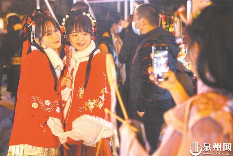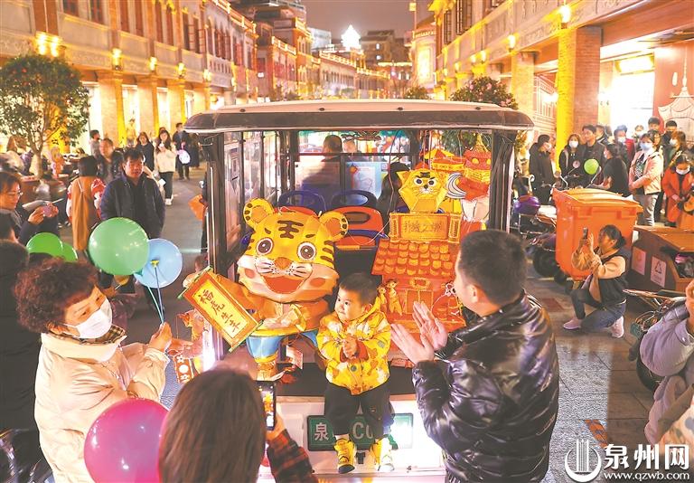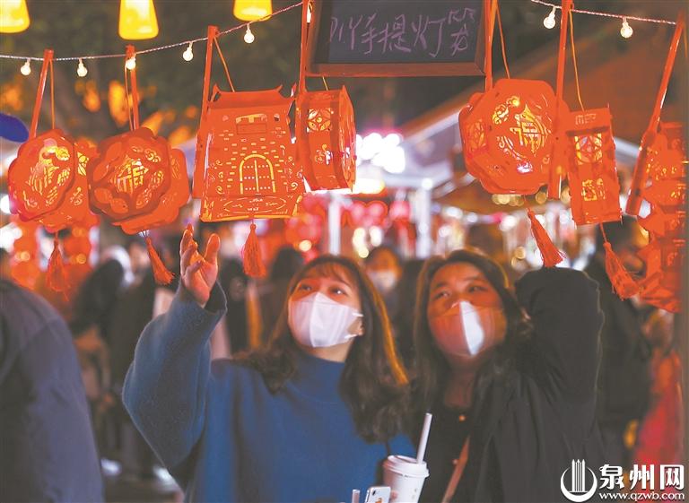 喜迎元宵佳节,泉州古城大街小巷到处洋溢着浓浓的喜庆气氛。夜晚的中山路,骑楼下的花灯交相辉映,流光溢彩;一盏盏精美、造型别致的花灯夺人眼球,美不胜收;身着传统古风服饰出行的市民手提花灯,漫步在古城小巷中,让人仿佛穿越回古时的繁华。