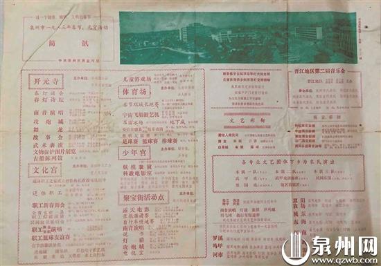 上世纪70年代末、80年代初,泉州元宵灯展在开元寺举行,从收藏爱好者蔡其呈提供的一份泉州市1983年春节、元宵活动的简讯中看到,当时开元寺内有春灯谜会、春灯诗坛、南音演唱、攻炮城、舞龙、故事会、武术表演、文物保护展览,内容丰富多彩,人们在“拳头、烧酒、曲”中欢度佳节。