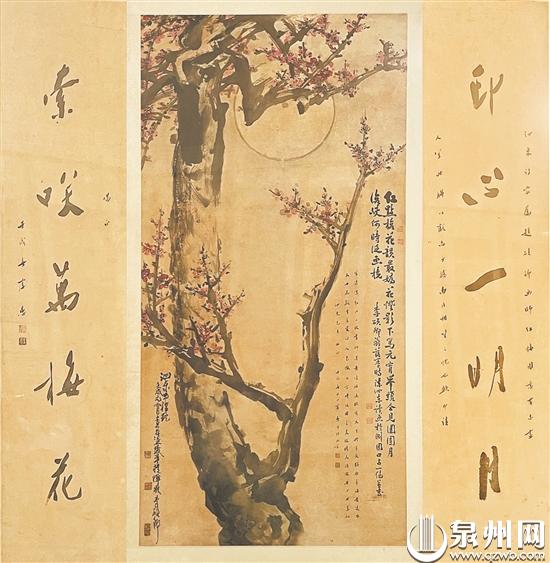 一幅创作于1982年泉州元宵春灯诗会的《红梅图》,因同时拥有著名国画家李硕卿,我国著名的因明学家、书法家虞愚和陈泗东的墨宝,成为了泉州书画界、收藏界一件少见的珍品。