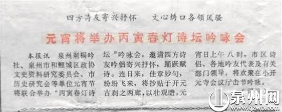 1978年起,作为元宵灯会的重要节目之一,在开元寺内举办的春灯诗会,是每年泉州文史界、文艺界的一大盛事。
