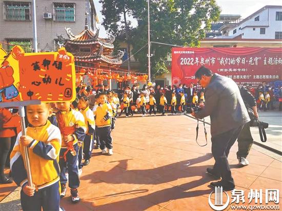 在英都翁山洪氏家庙广场,英都镇中心幼儿园的小朋友将鼓敲得咚咚响。40多位小朋友将福灯按1米间隔悬挂在绳子上,一起拉着绳子,绕场表演起儿童版“拔拔灯”。幼儿园的洪老师兴奋地说:“孩子们才排练了两三天,就拔得很好,他们太棒了。”据悉,平常孩子们在幼儿园也有举行“拔拔灯”游戏,但这样大型的户外“拔拔灯”,对孩子们来说还是第一次。