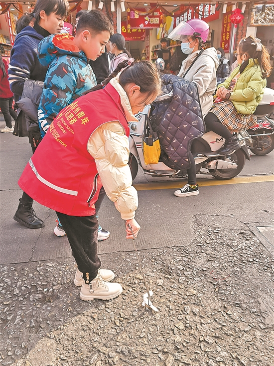 泉州网2月17日 (记者魏晓芳 文/图)昨日,在泉州市区西街,出现一群身穿红马甲的小志愿者,他们穿梭在人群中,捡拾垃圾,宣传文明旅游。