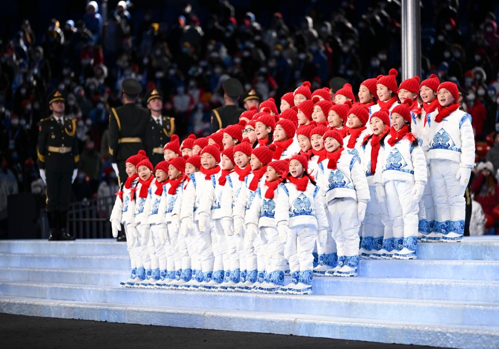 2月20日晚,北京第二十四届冬季奥林匹克运动会闭幕式在国家体育场举行。这是孩子们演唱奥林匹克会歌。新华社记者鞠焕宗摄