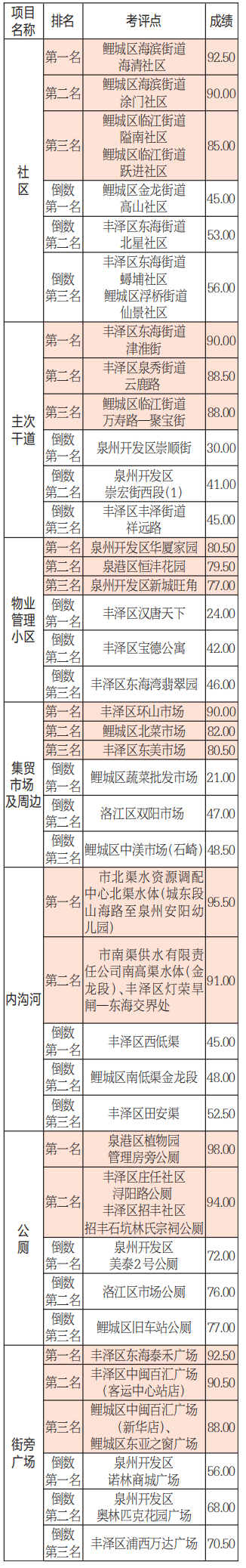 2022年1月份,市城管局考评中心按照《泉州市市容和环境卫生综合考评工作方案》要求,加强中心城区市容和环境卫生管理综合考评,抽评了70个社区、59个住宅小区、83条主次干道、26座集贸市场、14座便民市场、52条内沟河、6条江岸带、20个街旁广场、77座公厕、60条主次干道绿化,共发现问题8277处。各区综合成绩为:泉港区74.41分、洛江区74.21分、鲤城区71.76分、丰泽区69.28分、泉州开发区63.26分。