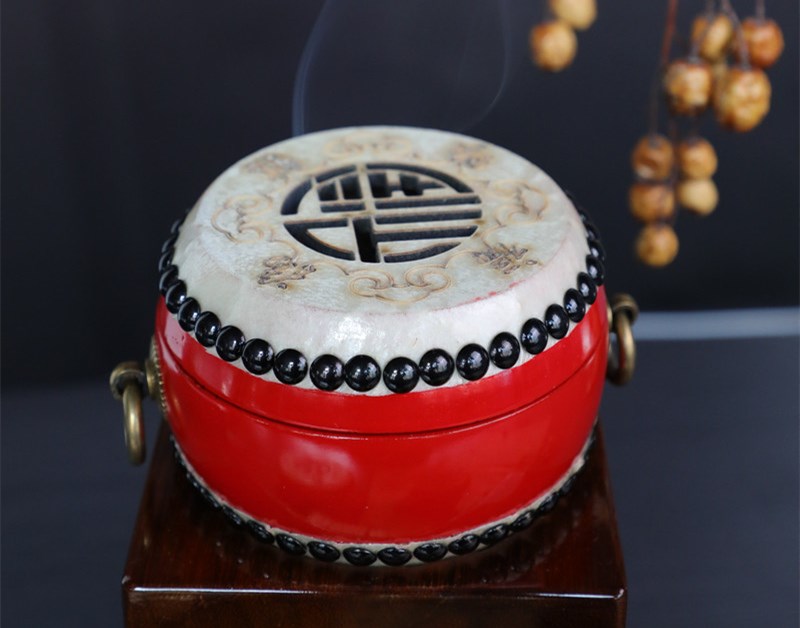 作品《福鼓飘香》以“圆福”镂空花纹图案表达圆满幸福之意,鼓形香炉飘出缕缕“福气”。