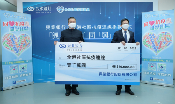 3月3日,兴业银行在福州、香港两地同步举行“兴暖香江,同兴抗疫”线上捐款仪式,通过香港分行向“全港社区抗疫连线”捐赠1000万元港币驰援抗疫一线,与香港市民一起守望相助、共克时艰。香港中国企业协会总裁张夏令、“全港社区抗疫连线”总召集人陈振彬,兴业银行董事长吕家进、副行长孙雄鹏出席捐款仪式,香港民政事务局署理局长陈积志作视频致辞。