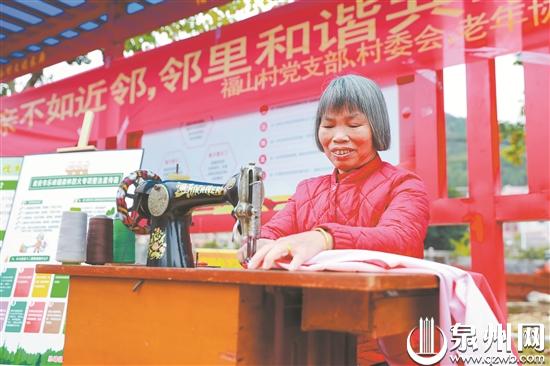 一位白发苍苍的阿婆坐在缝纫机边,仔细为街坊邻居们义务缝补衣服。阿婆名叫潘梅华,今年67岁,她说:“我在村部附近开了一间缝纫店,有20多年了。今天已经补了7件衣物,看到大家开心,我也很开心。”