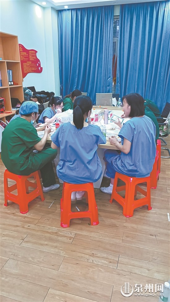 工作间隙,医务人员吃上热饭。