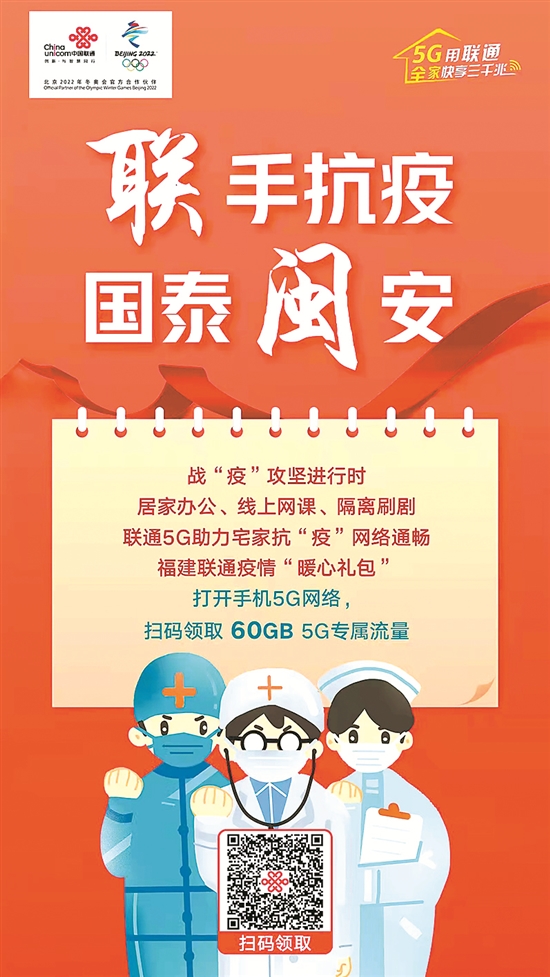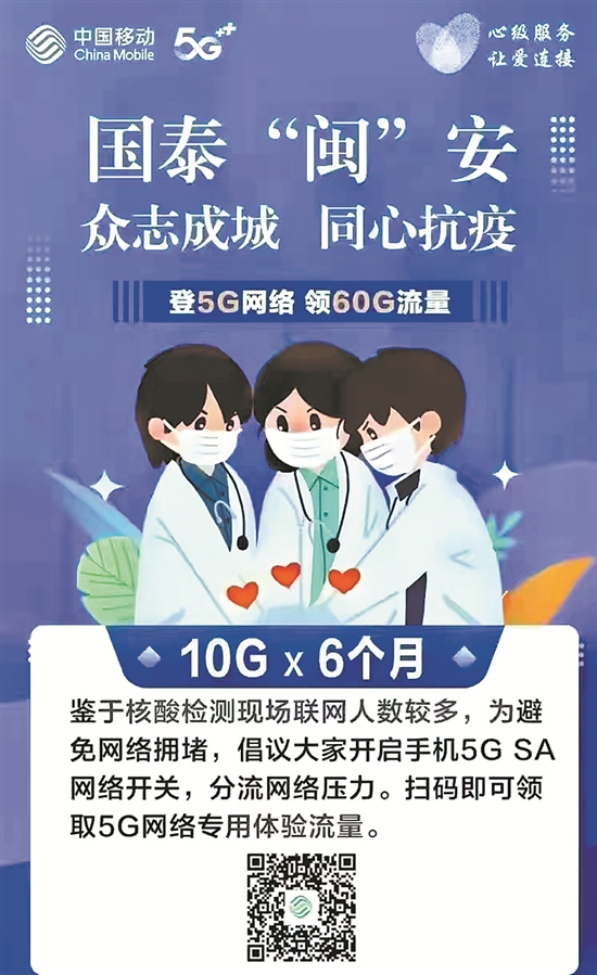 日前,泉州市数字办组织移动、电信、联通等通信运营商分别免费提供“10G×6个月”“50G×3个月”“10G×6个月”等5G专属流量包(扫下方二维码领取),为防疫通信网络保驾护航。