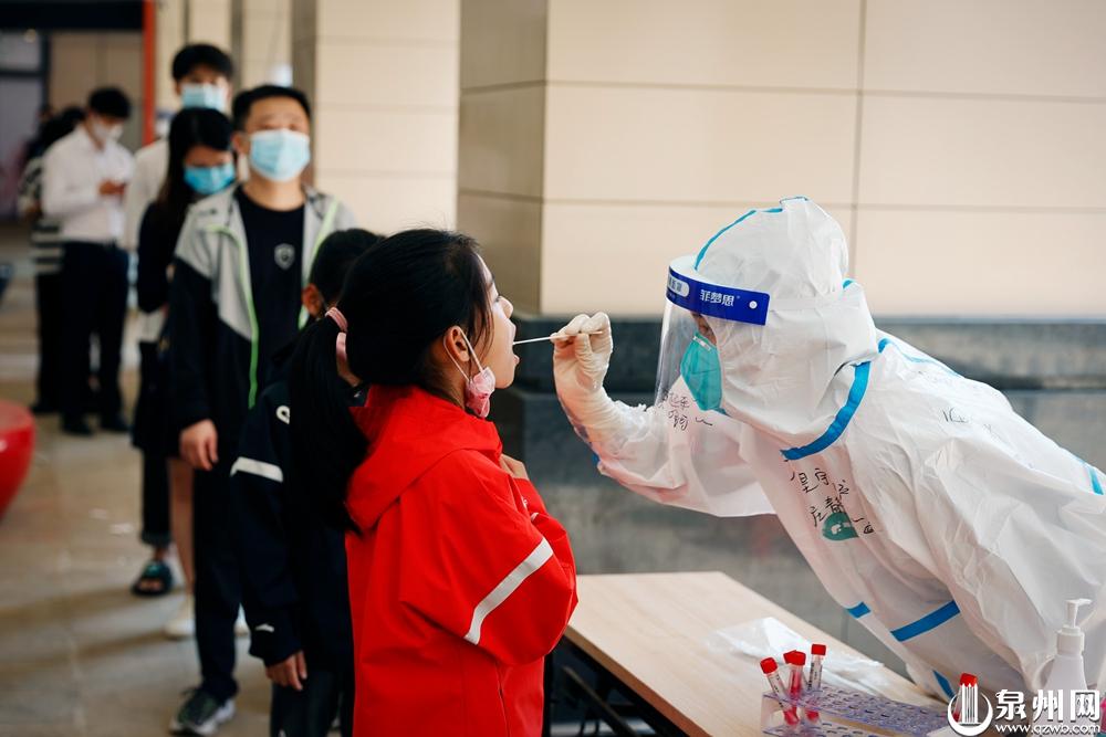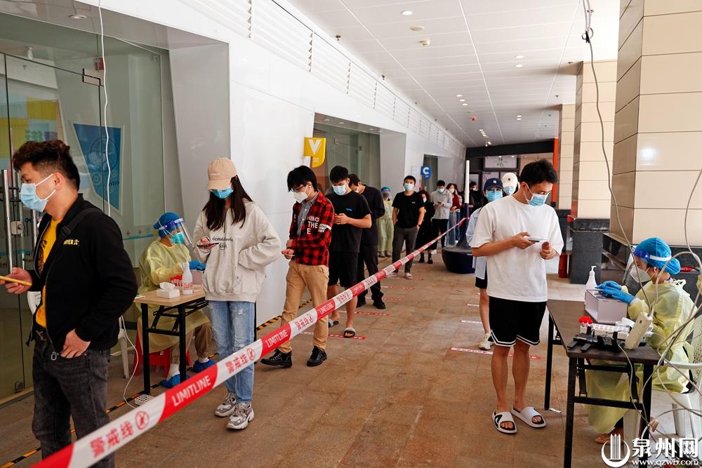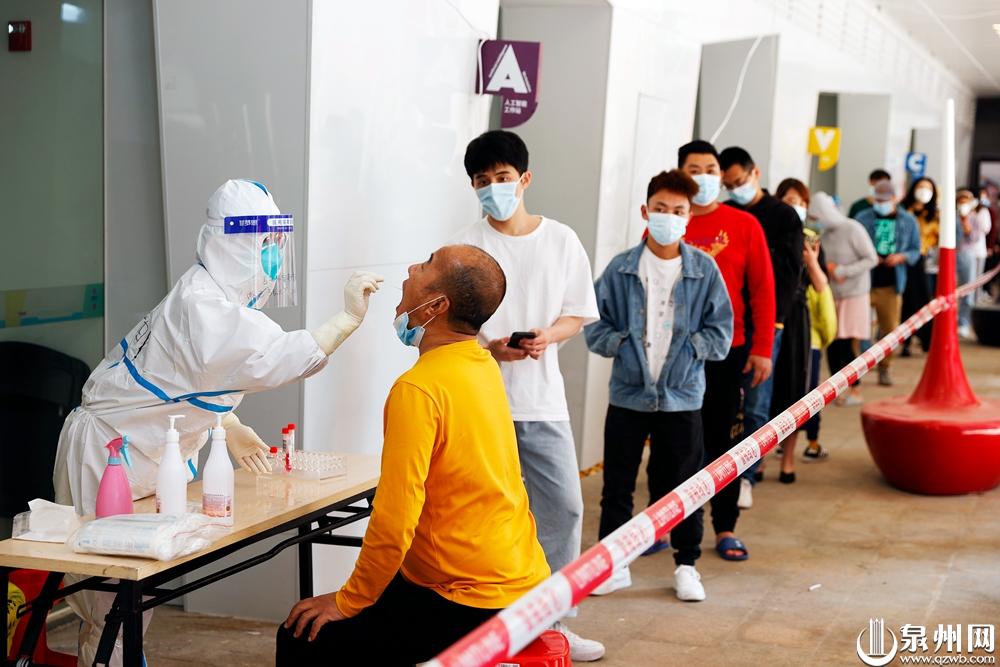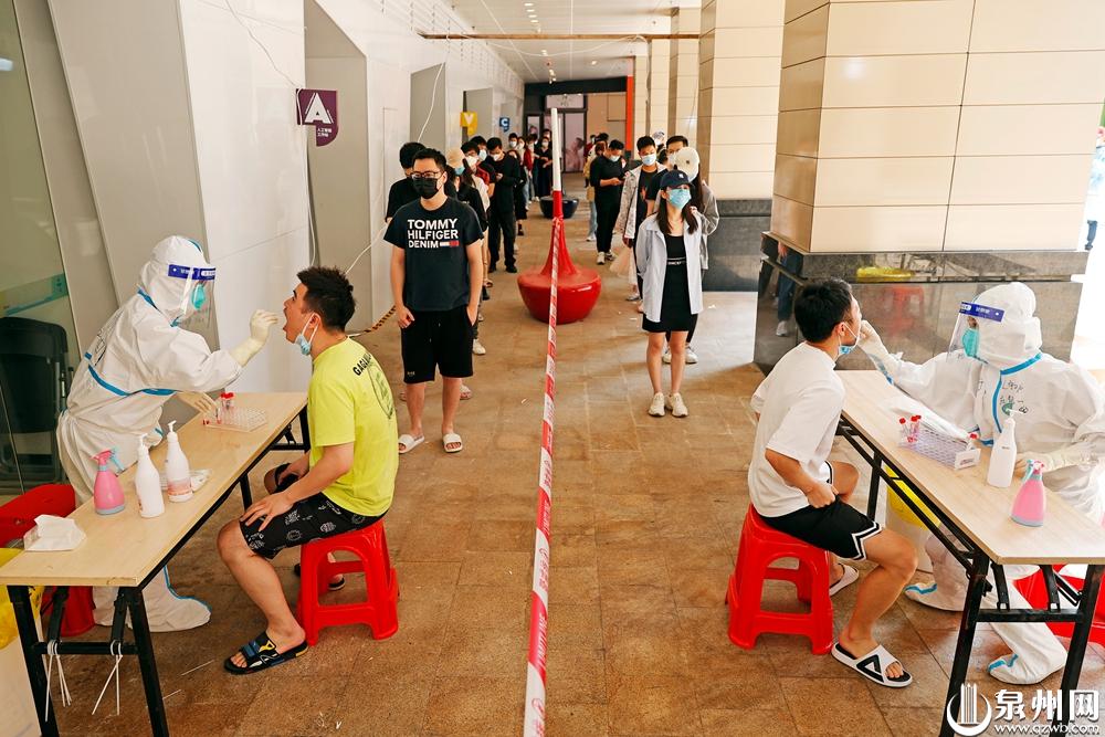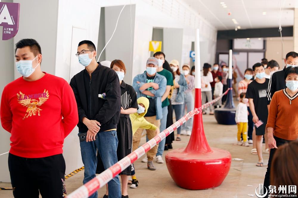 20日6时起,丰泽区、鲤城区、洛江区、石狮市、晋江市、南安市、惠安县、德化县、泉州开发区、泉州台商投资区等10个重点区域开展新一轮大规模人群核酸检测,进一步排查潜在的新冠肺炎病毒感染人员。在丰泽区东海街道东海泰禾首玺下沉广场核酸采样点,市民有序自觉排队做核酸。(陈晓东 摄)