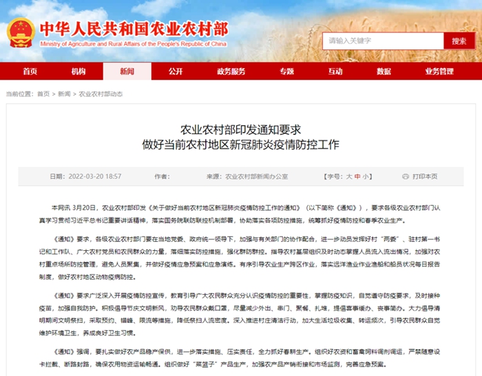 3月20日,农业农村部印发《关于做好当前农村地区新冠肺炎疫情防控工作的通知》(以下简称《通知》),要求各级农业农村部门认真学习贯彻习近平总书记重要讲话精神,落实国务院联防联控机制部署,协助落实各项防控措施,统筹抓好疫情防控和春季农业生产。