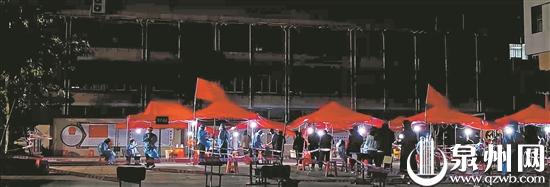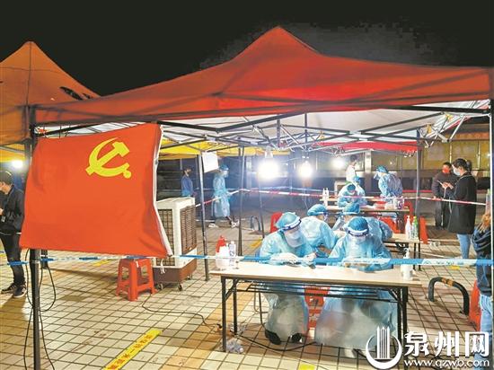 夜里,党旗在核酸检测采样现场熠熠生辉。(赖瑶琼 摄)