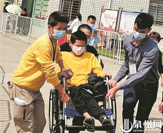 在东梅社区,志愿者和社区人员一起帮助行动不便的群众前往采样现场。(杨于兰 摄)