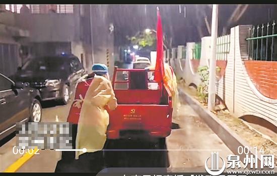记者了解到,视频拍摄者是来自泉州金控集团的志愿者唐润。他说,那辆三轮车专门用来给封控区的居民运送物资以及配送三餐,当天晚上要回“营地”的时候车子没电了。“两名志愿者一前一后推着车子,天正好下着雨,我就随手拍了个视频。”