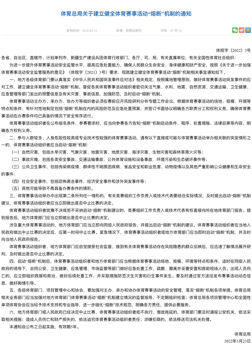公告称,地方各级体育部门要督促各类体育赛事活动组织者密切关注气象、水利、地震、自然资源、交通运输、卫生健康、应急管理等部门发出的预警信息及有关灾害、事故信息,加强防范,及时启动“熔断”机制。