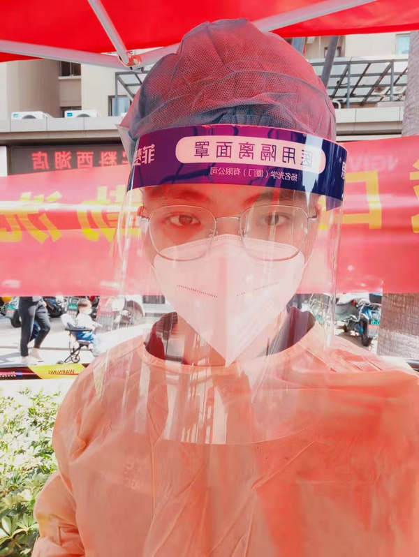 为了更好地服务社区居民,他必须先好好保护自己,蓝色的防护服穿上,厚厚的头罩面罩口罩之下,忽闪着地是他的两只大眼睛。“请大家排好队,保持一米距离,有问题可以问我。”一句简单的话语,黄品秋一天要说成百上千次,直到嗓子“冒烟”也没有停歇。