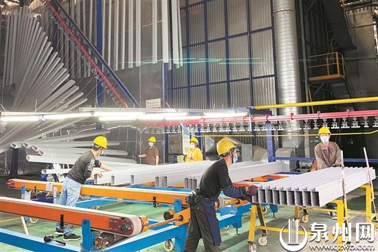 闽发铝业车间里,工人们正有序组织生产。