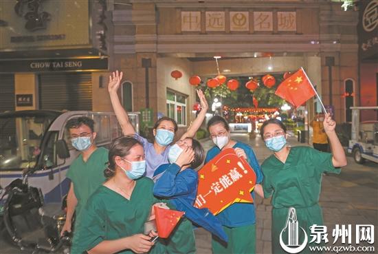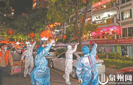 泉州网4月7日讯 (记者陈明华 陈凌鹭/文 林劲峰/图)“解封啦!谢谢你们,你们辛苦了!”昨晚,位于东美社区的世纪巨星、中远名城小区迎来解封,小区业主站在阳台上,挥舞着国旗,激动地向楼下的医护人员、志愿者喊话表示感谢。