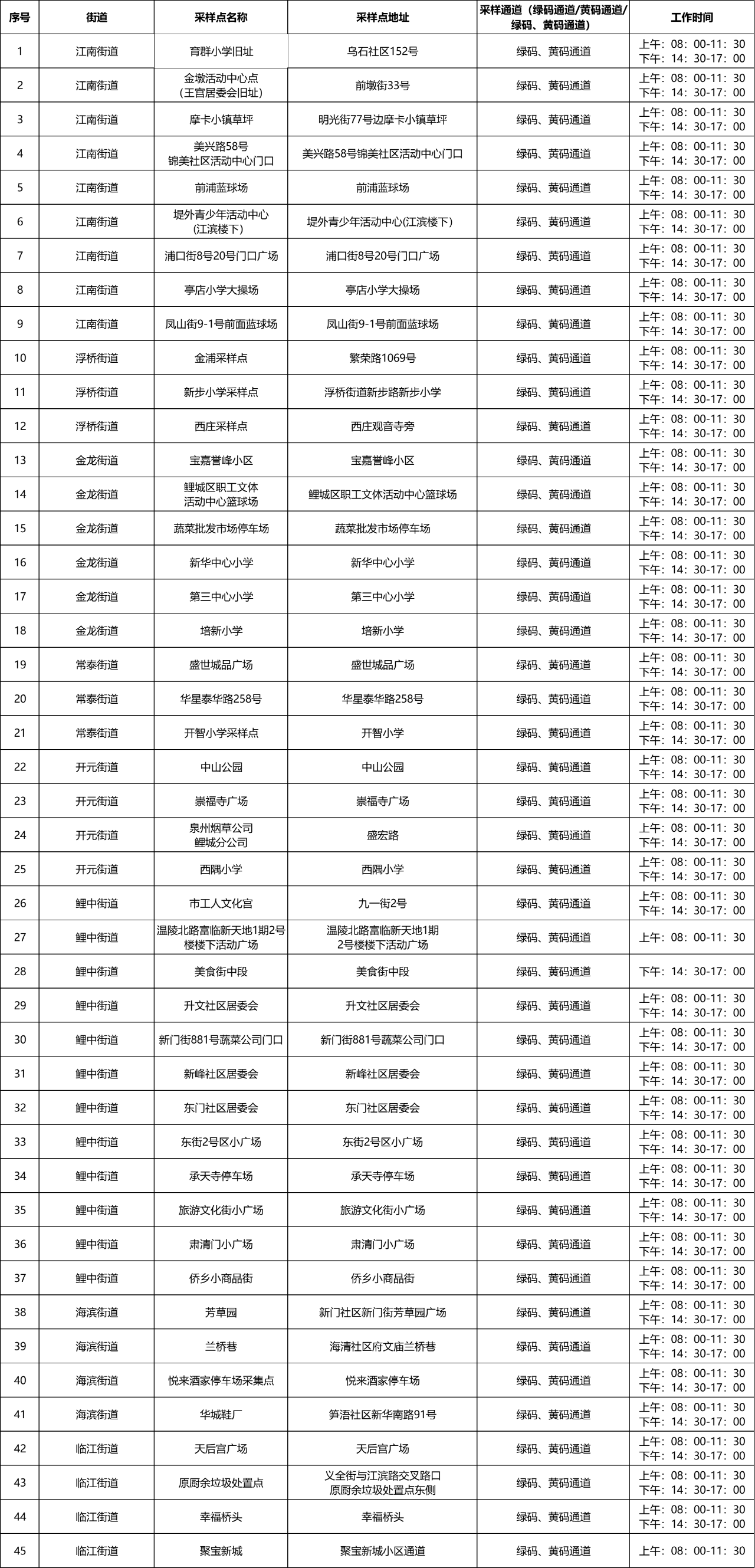 鲤城区便民免费核酸采样点名单
