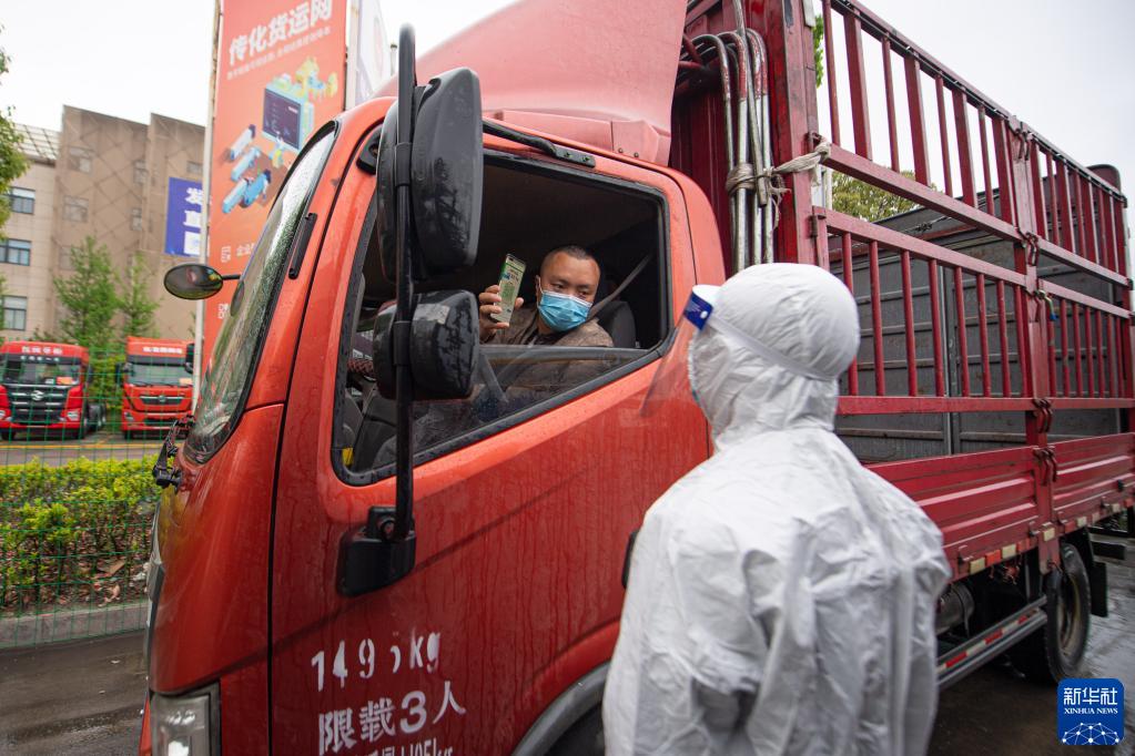 4月13日,工作人员查验驶入杭州传化公路港的货车司机健康码。新华社记者 江汉 摄