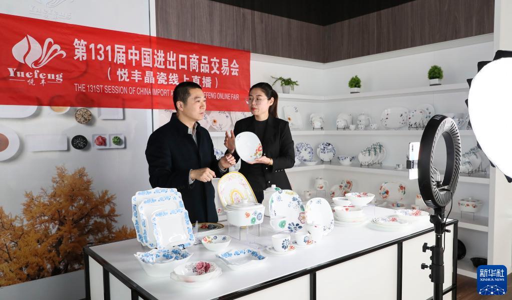 4月15日,第131届中国进出口商品交易会线上开幕。在江苏省淮安市洪泽区,一家陶瓷企业的工作人员在展厅直播介绍产品。新华社发(赵启瑞 摄)
