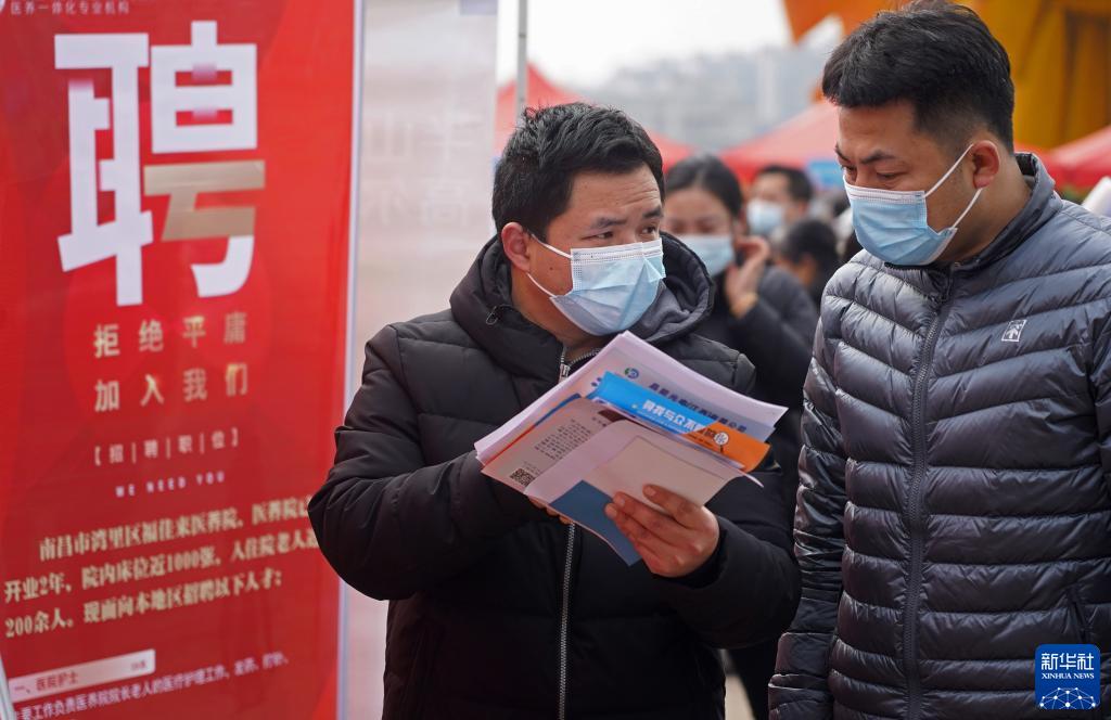 2月25日,江西省南昌市湾里管理局开展“春风行动”线下招聘活动。这是求职者在招聘会现场交流。新华社记者 万象 摄
