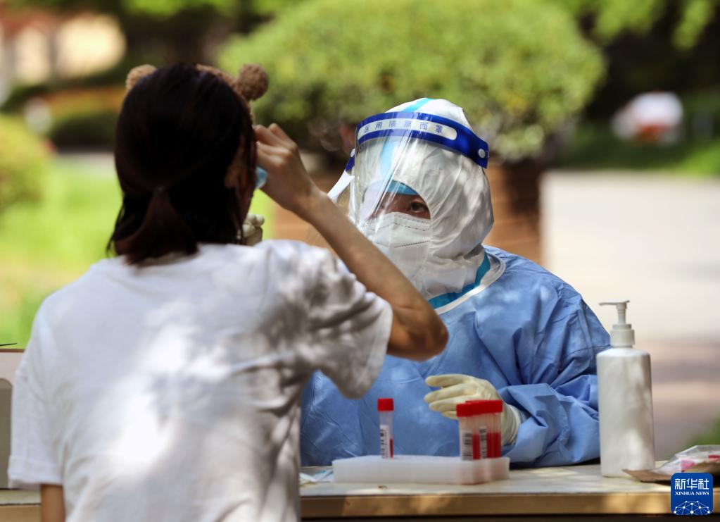 4月12日,在上海松江区一居民小区内,医务人员进行核酸检测采样。新华社记者 刘颖 摄