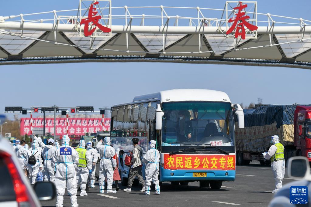 在吉林长春高速公路东出口,返乡农民登上返乡公交专线(4月12日摄)。新华社发