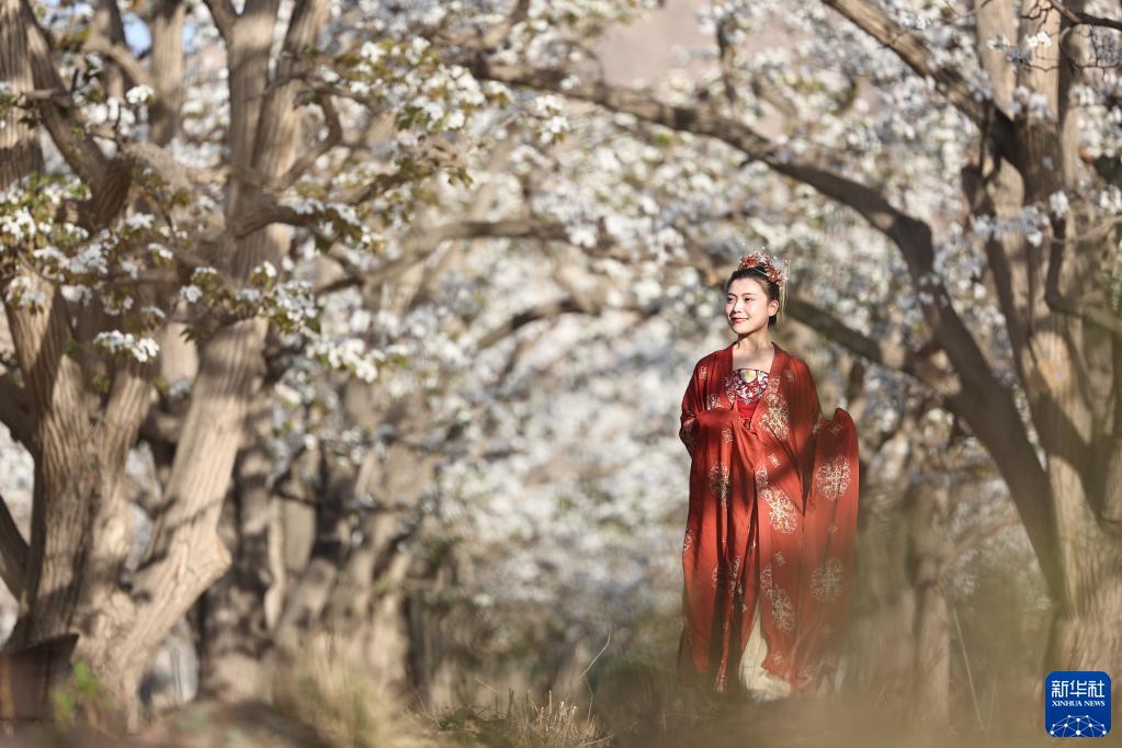 4月7日,景区工作人员在甘肃省兰州市皋兰县什川镇百年梨园内进行表演。受疫情影响,景区组织工作人员在梨园内直播,邀请人们“云赏花”,满足公众赏花需求。新华社记者 陈斌 摄