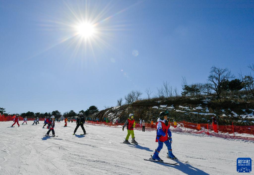 在天津蓟洲国际滑雪场,教练与小朋友在雪道上练习滑雪(2月20日摄)。新华社记者 孙凡越 摄