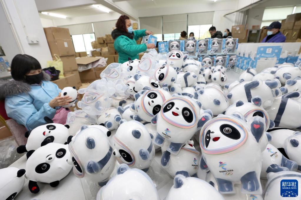 2月8日,工人在位于江苏省启东市的一家特许生产商的车间里包装“冰墩墩”。新华社发(许丛军 摄)