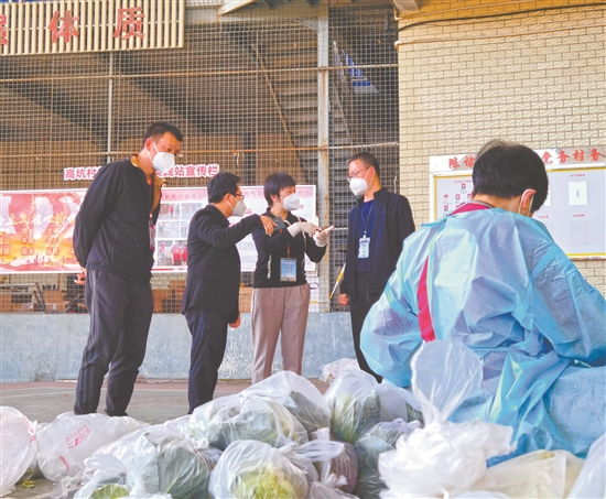 泉州市纪委监委驻陈埭镇疫情防控联合督查组第四组组长王佳惠(中)到陈埭高坑村了解封控区物资保障供应工作开展情况(王芳 摄)