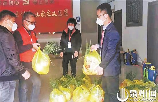 志愿者帮村民统一采购蔬菜,并分发到户。