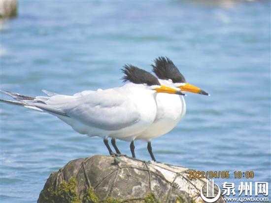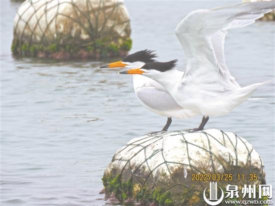 “3月25日发现4只,4月初发现6只,泉州晋江围头湾就像它们的第二故乡,每年会飞来一两个月时间。”晋江围头村保护海上野生动物志愿队执行队长徐万春告诉记者,观测到这几只中华凤头燕鸥时,它们正在围头湾离沙滩约3公里的鲍鱼养殖区,与上百只的大凤头燕鸥一起,站在海中的浮标上边晒太阳嬉戏觅食。它们头顶上的冠羽为黑色,背部、肩部和翅膀上的羽毛为灰白色,嘴部呈黄色,尖端有一截黑色,因此也叫“黑嘴端凤头燕鸥”。2019年围头湾发现中华凤头燕鸥的踪迹时,徐万春就经常和水鸟调查员一起出海,如今他自己也成为一名水鸟调查员。