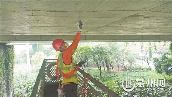 昨日,记者在施工现场看到,桥隧分中心工作人员正继续进行桥梁梁体的病害修复。晋江大桥病害处治工程除了桥梁梁体的常规病害修复,还将对斜拉索PE护套进行更换、清理烘干全桥208个斜拉索锚头积水、对104个斜拉索下锚头增设锚具保护罩、在原桥面加铺6毫米沥青路面封层微罩面等。