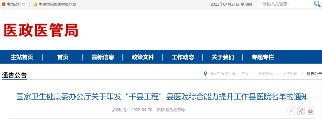 近日,国家卫生健康委印发《“千县工程”县医院综合能力提升工作县医院名单》,明确了参与“千县工程”县医院综合能力提升工作的县医院,标志着“千县工程”县医院综合能力提升工作全面启动。通知详情如下——