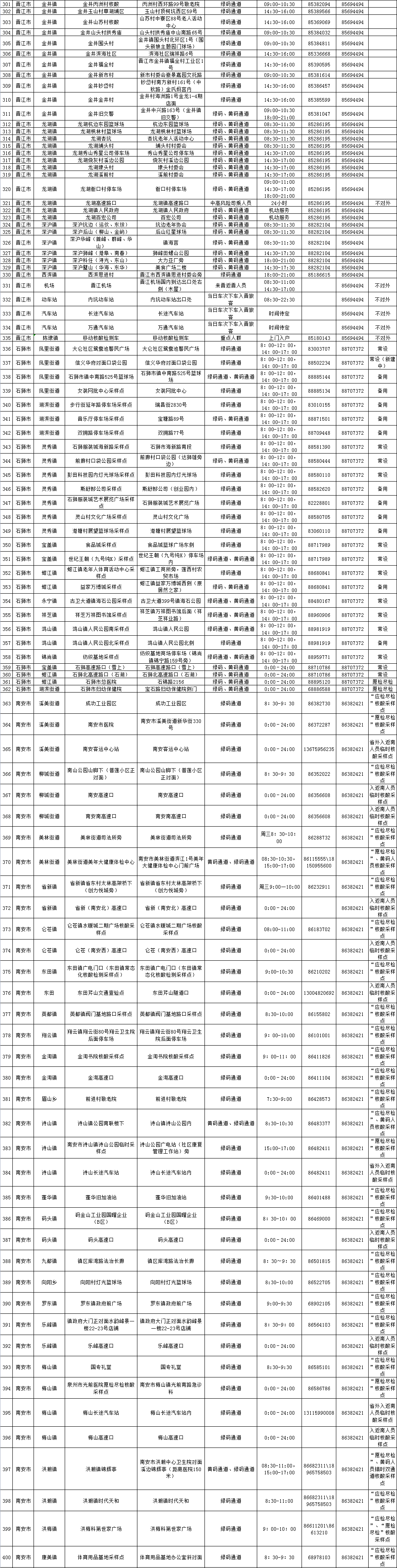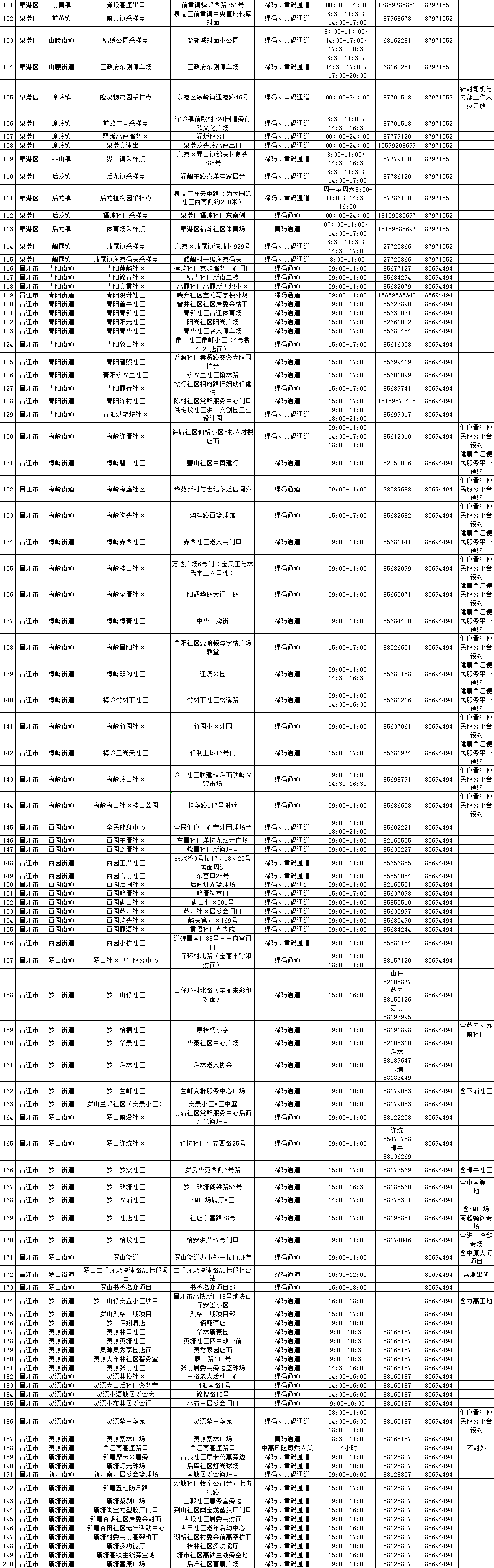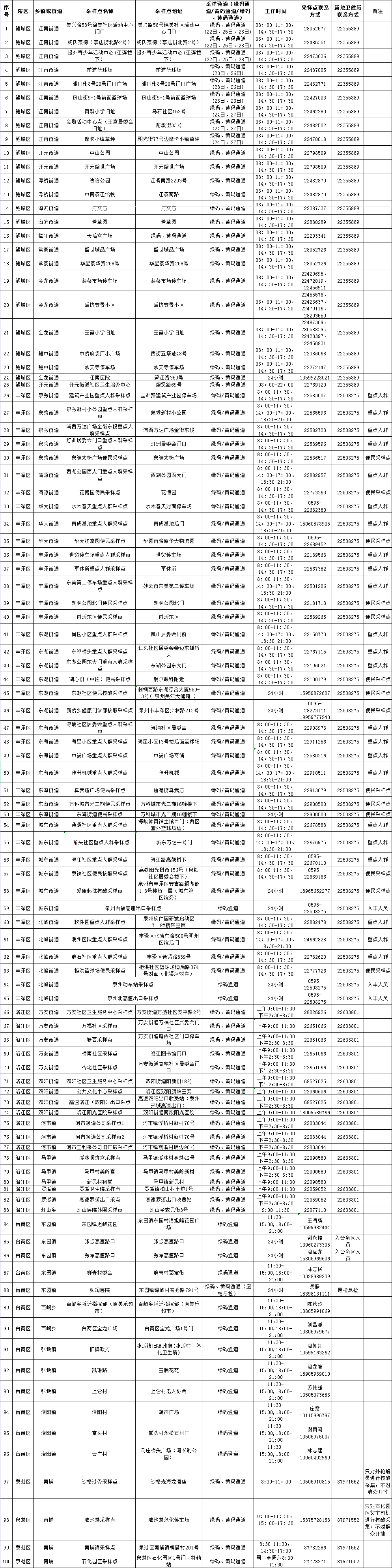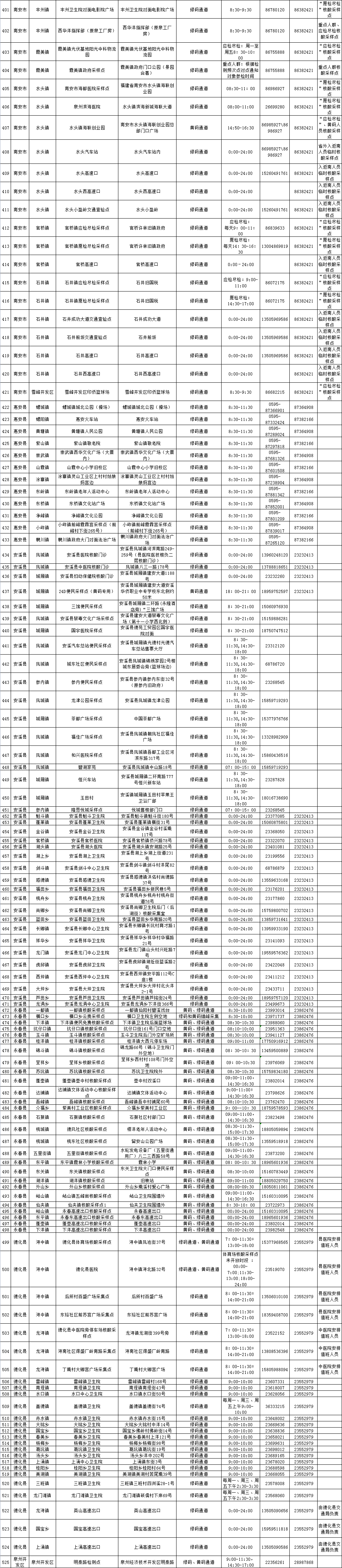 泉州网4月22日讯(记者 郭雅莹)目前,泉州市全域均为低风险地区,为落实好常态化核酸检测工作,满足群众外出、进出公共场所、乘坐公共交通工具以及各类重点人群的核酸检测需求,我市继续提供便捷、高效的核酸检测服务,在4月22日至28日设置了525个便民采样点,方便群众选择就近、适时的采样点进行核酸检测。