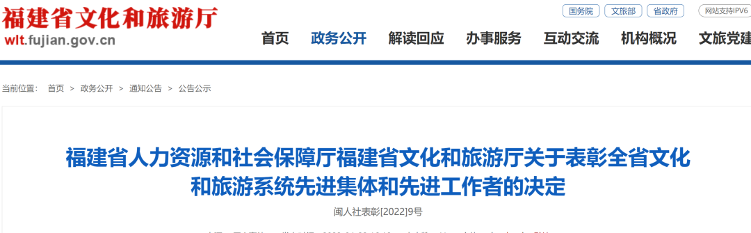 福建省人力资源和社会保障厅、福建省文化和旅游厅发布关于表彰全省文化和旅游系统先进集体和先进工作者的决定,福建44个单位、94名个人上榜