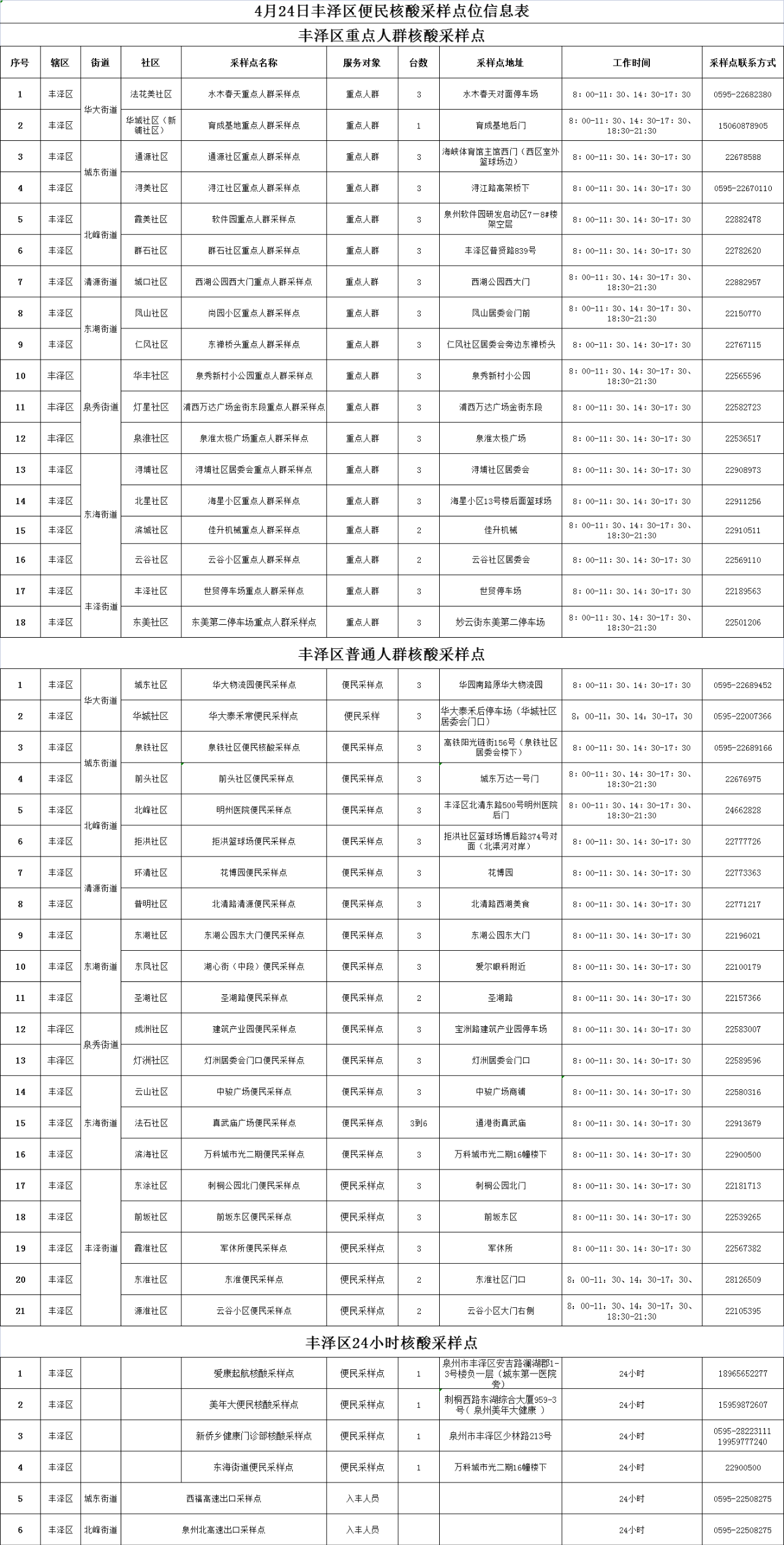 根据近两日采样点各类人群核酸需求情况,丰泽区调整优化重点人群、普通人群、24小时核酸采样点如下: