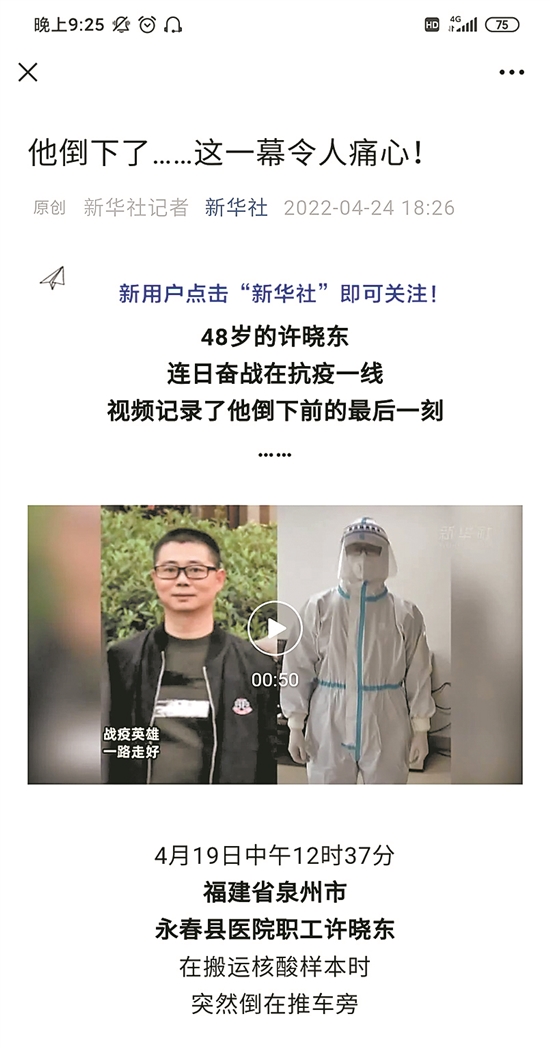 永春县医院职工许晓东倒在抗疫一线,新华社官微头条转载泉州晚报社相关报道