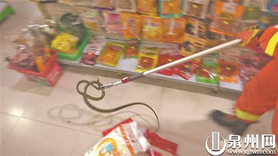 泉州网4月27日讯 (记者陈明华 通讯员康振兴 吴文霞 文/图)4月25日15时27分,一条蛇溜进晋江市龙湖镇石龟村一超市,吓坏店主。接到报警后,晋江市龙湖消防救援站立即派出消防救援人员前往处置。