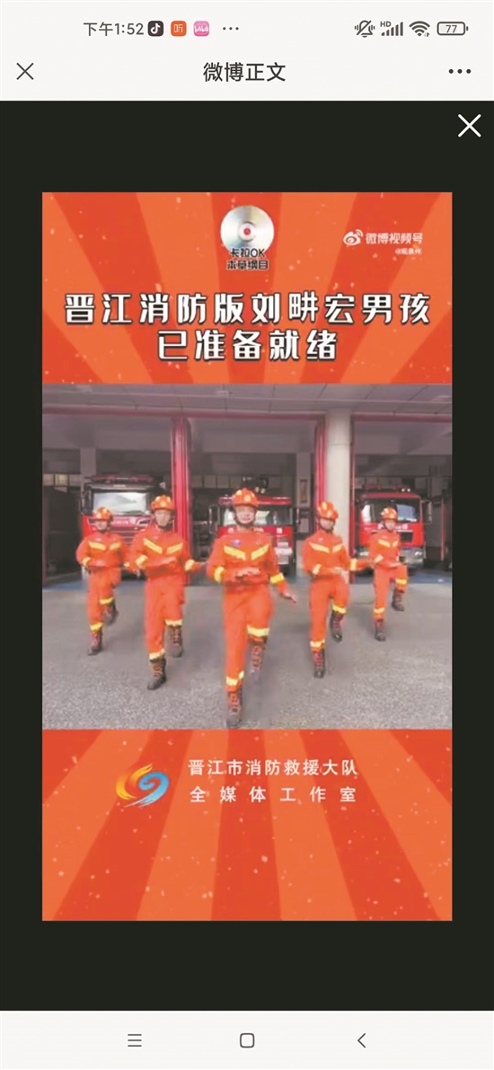日前,晋江市消防救援大队也推出《晋江消防版刘畊宏男孩》,30秒的短视频里,“蓝朋友”们跳起整齐划一的本草纲目版毽子操,在微博上网友纷纷跟帖点赞,果真消防员们除了灭火、救人,也是比拼舞技的“全能选手”。